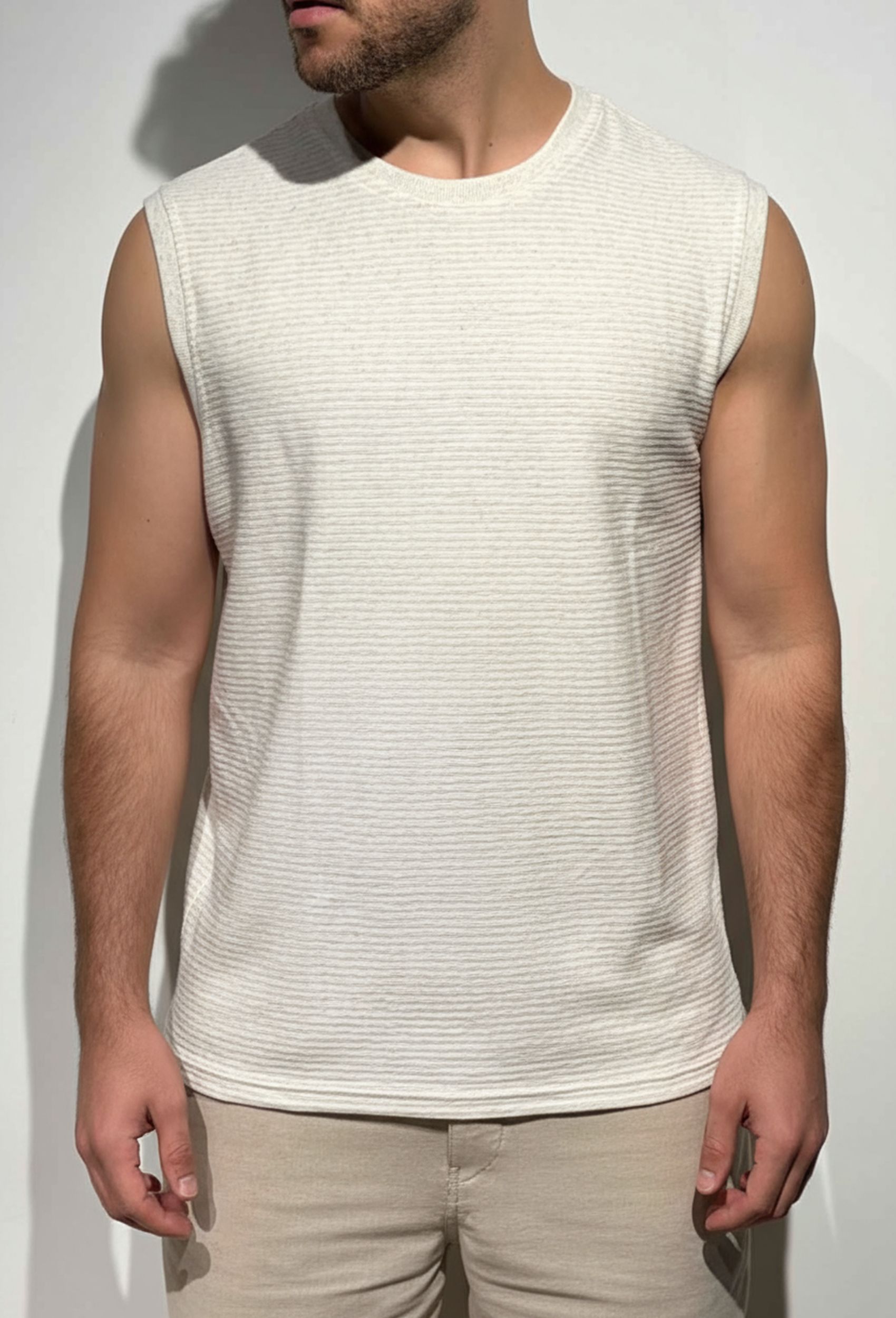 Regata confeccionada em malha tricô texturizada. A modelagem é machão com ombros largos, cavas amplas e acabamento em ribana.